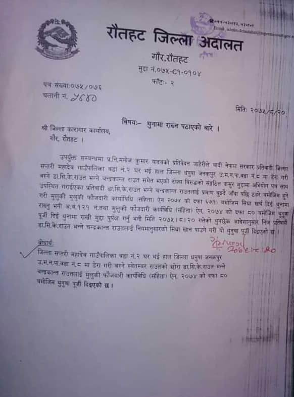 गौर – स्वतन्त्र मधेशको माग गर्दै आएका डा. सिके राउत रौतहट जिल्ला अदालतको आदेशमा पुर्पक्षको लागि जेल चलान भएका..